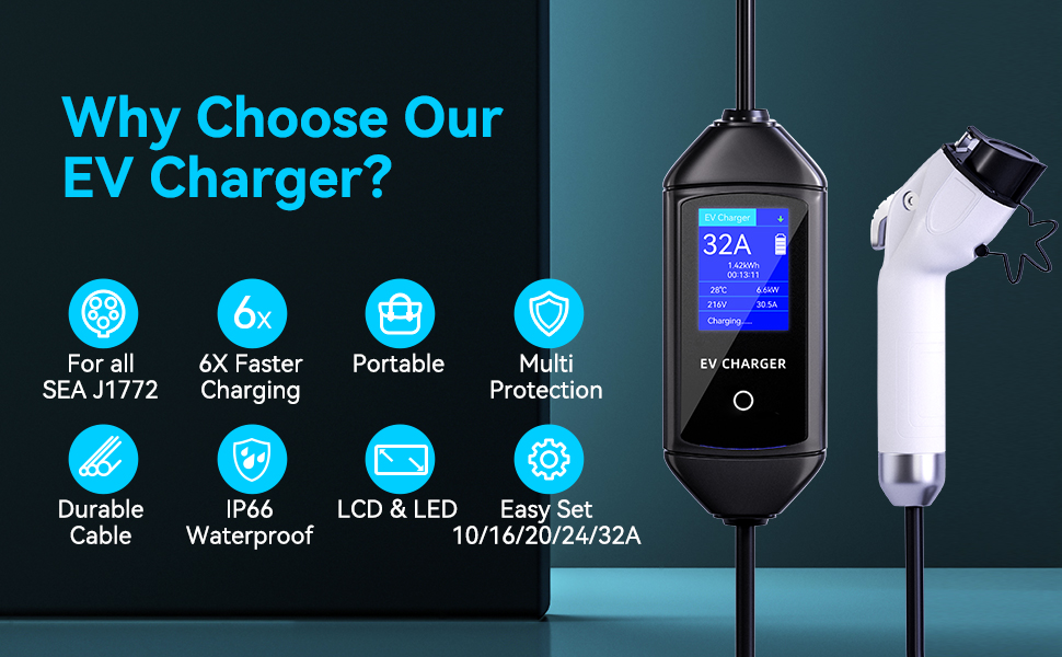 This 32A level 2 portable EV charger with NEMA 14-50 plug could charge your car 6x faster than other 16A level 1 EV chargers you have used before.